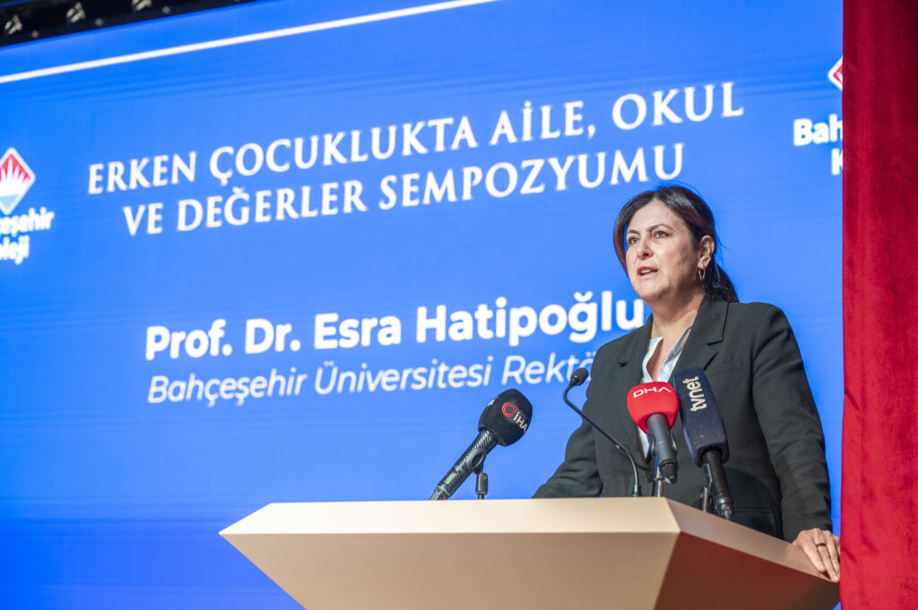 Bahçeşehir Üniversitesi Rektörü Prof. Dr. Esra Hatipoğlu, “Çocuklarımızın nasıl bir dünyada, hangi değerlerle büyüyeceğini birlikte düşünmek için bir aradayız. Bu yönüyle sempozyum, eğitim liderlerimiz ve ailelerimiz için düşünme ve üretme üzerine güzel bir zemin sunmaktadır. Erken çocukluk dönemi, çocuklarımızın en kritik evresidir. Çünkü her biri karakterinin ve değer dünyasının şekillendiği bir süreçten geçmektedir. Bu süreçte çocuğun hayatında iki temel rehber bulunur. Bunlardan bir tanesi aileleri, bir tanesi eğitim kurumlarıdır” şeklinde konuştu.