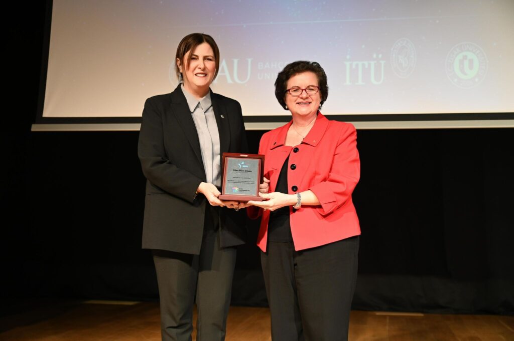 Ödül töreni sonunda Bilim Kahramanları Derneği Yönetim Kurulu Başkanı Prof. Dr. Sıddıka Semahat Demir, katkılarından dolayı Bahçeşehir Üniversitesi Rektörü Prof. Dr. Esra Hatipoğlu’na teşekkür plaketi takdim etti.